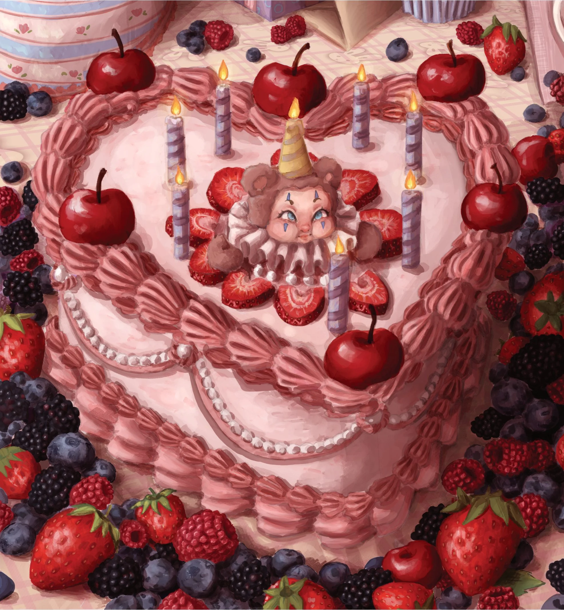 ILLUSTRATIONS Bojangles Tea House Berry Birthday Little Leprechaun Bear and Frog American Bumble Bee The Sisters Girl in Pieces Book Cover Merlin Jester Front Merlin Jester Back Merlin Jester Props Tour Guide Maia Plush Party Game Board Fight!